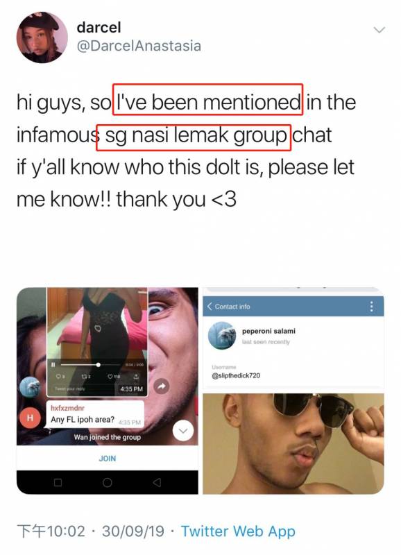隨後,Darcel Anastasia在Twitter上傳了一張在SG Nasi Lemak群內的聊天截圖。而圖中,就是自己的一段性感影片。