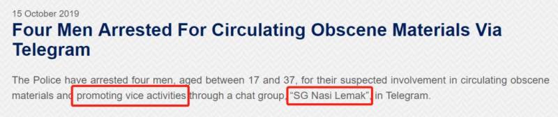 其中兩名男子是SG Nasi Lemak聊天群的管理員,而另外兩名青少年則負責對外銷售色情材料(當然,這些材料中還包括一些掀裙圖片等)。