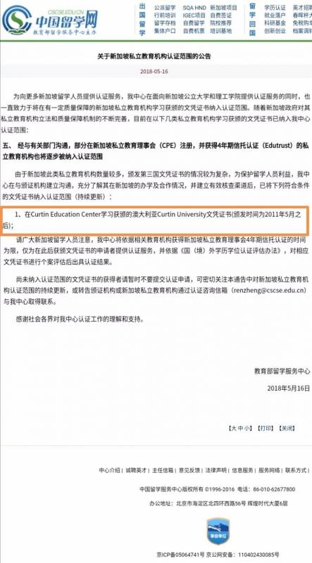 2018年5月16日,中國教育部留學服務中心主辦的中國留學網發布《關于新加坡私立教育機構認證範圍的公告》,其中科廷新加坡的機構名和文憑赫然在列!