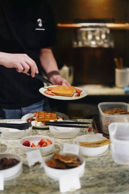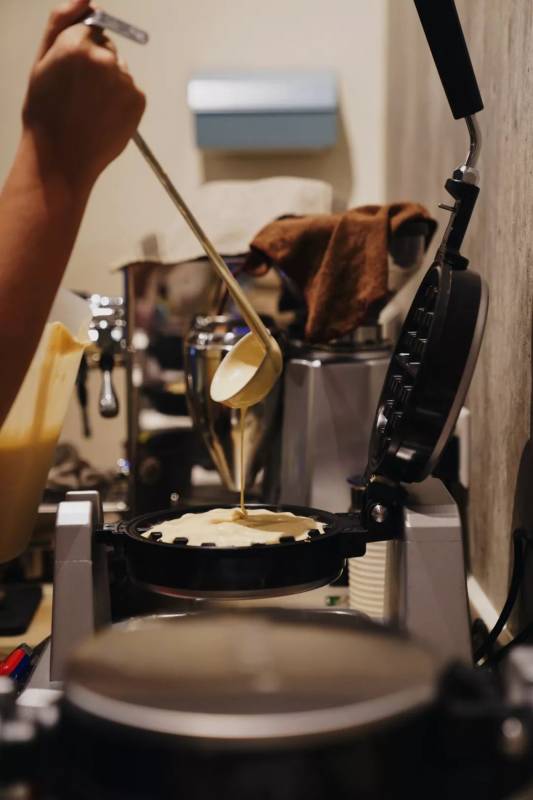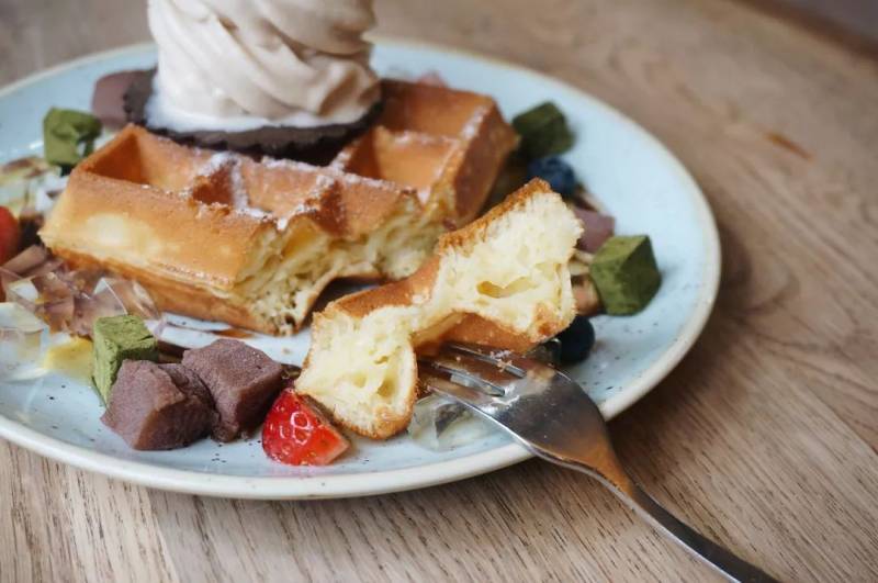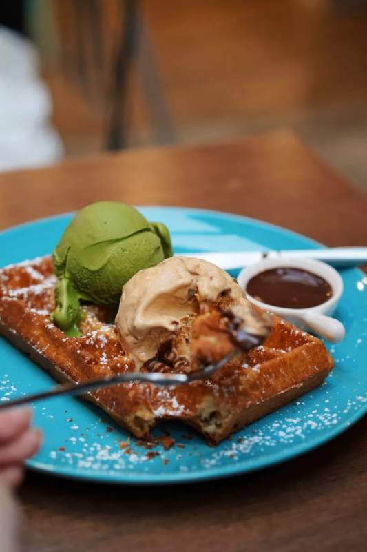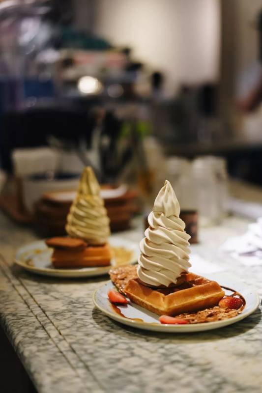 比如店裏永遠飄著現烤華夫餅和手沖咖啡的香味;華夫餅咬下去剛剛好的酥脆,內餡松軟綿彈,即使放上冰淇淋也能保持原來的口感,這水平太難超越;冰火交融的瞬間好吃哭。