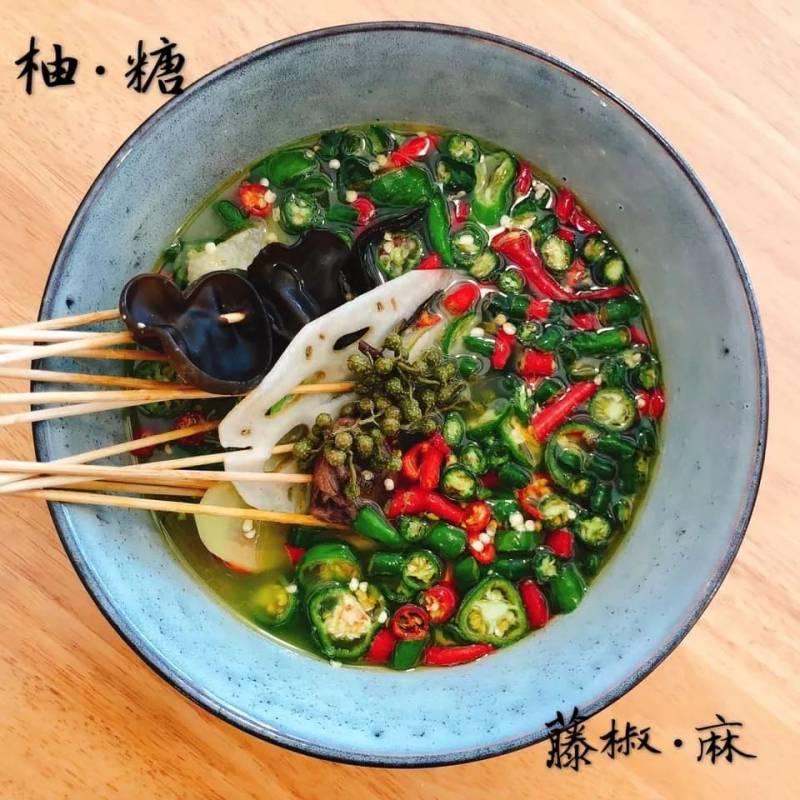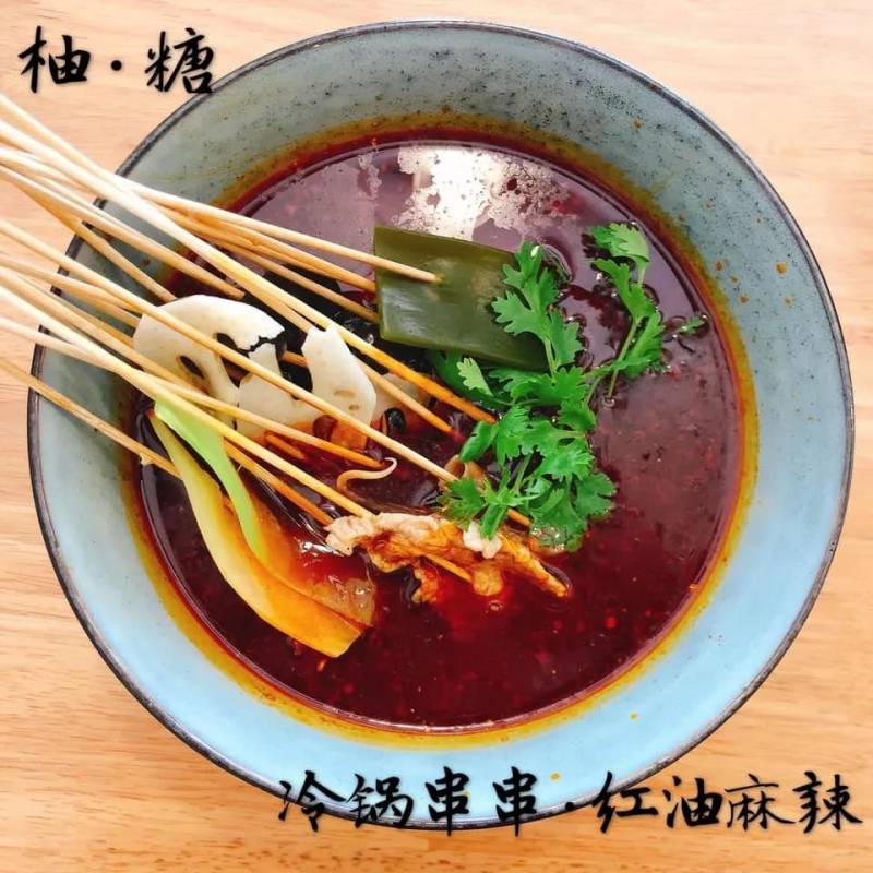 柚糖主打的是冷鍋串串,畢竟熱氣騰騰的火鍋會破壞仙女的精致與優雅。一共有五種冷鍋串串可以選擇,紅油,藤椒,缽缽雞,滋補雞湯和幹拌串串。