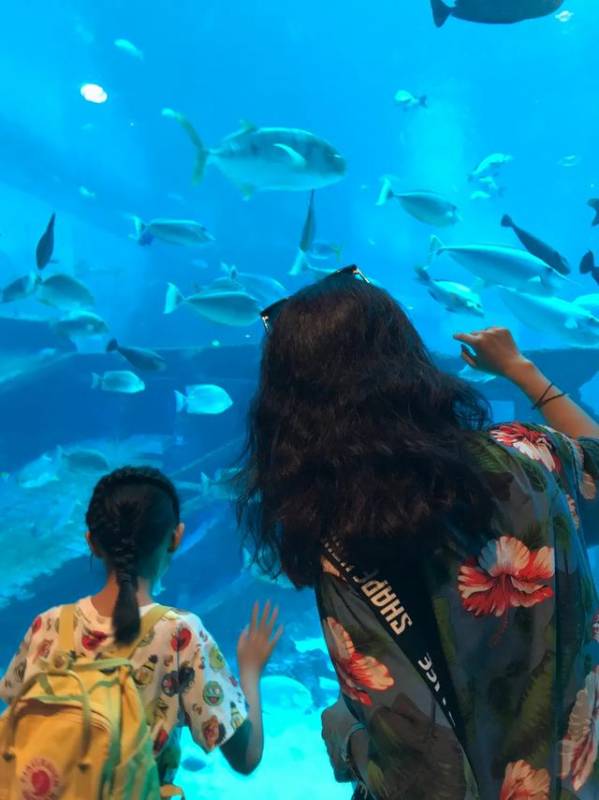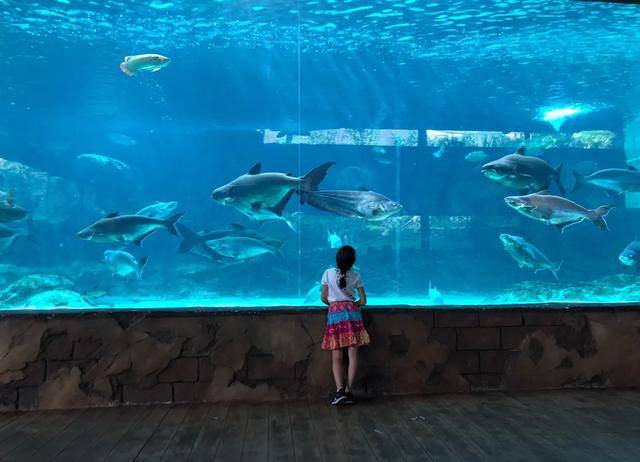 從環球影城出門後左手邊就是S.E.A海洋館,新加坡真的很小,景點其實也很小,雖然小,但是真的每個都精致好玩,海洋館絕對是孩子們的天堂,我女兒進入海洋館後,幽閉恐懼症自動治愈,激動的嗷嗷叫,走到最大的那面充滿魔鬼鲨的海洋池前,許多人都席地而坐,那面巨大的海洋池前貼心的鋪著地毯階梯狀的平台,很適合席地,吃點東西喝點水,就那麽靜靜地觀賞著那面巨大的鋼化玻璃後的海洋世界裏魚兒鲨兒們悠閑的遊著。