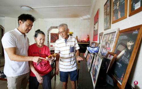 陳之財(左一)與父母一起看家裏的舊照片。(新加坡《聯合早報》/龍國雄 攝)