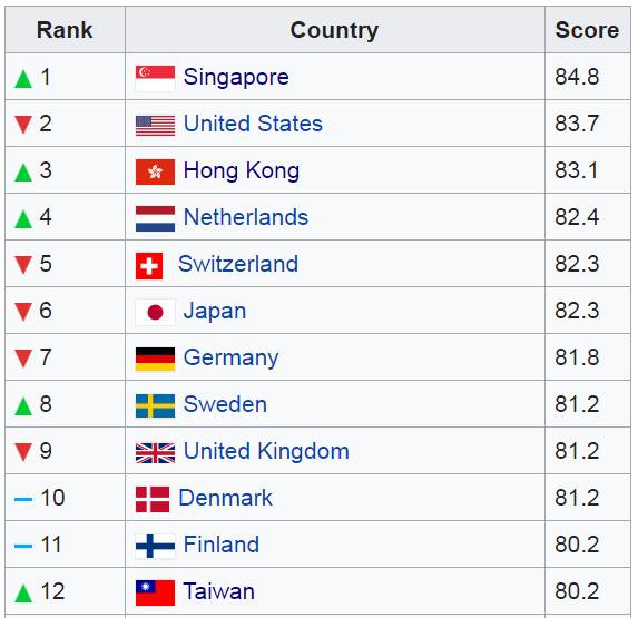 亞洲四小龍全部上榜,名列前茅,亞洲五小虎未能列前。