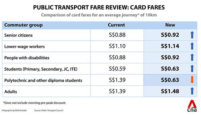 從12月28日起,以乘車卡(Ez-link)付費的成人車資每趟車程將上調9分,樂齡和學生優惠車資上調4分,以現金付費的巴士車資及地鐵單程車資則上調2角。