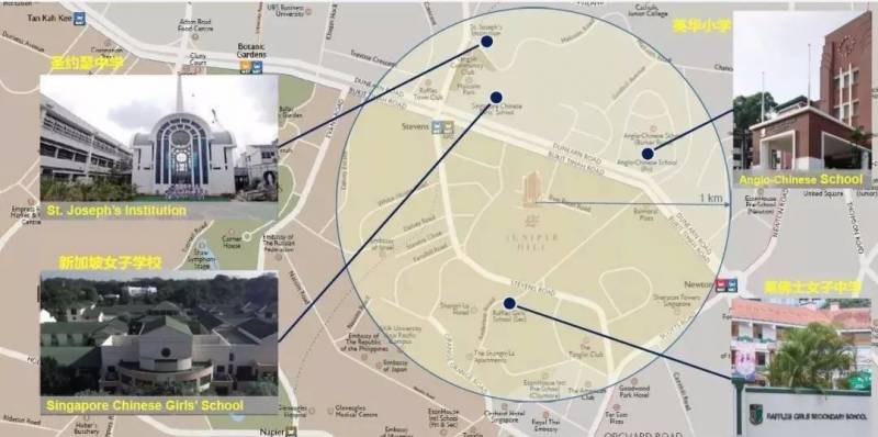 周邊的學校超級強大。一公裏內四所名校。分別是兩所小學:新加坡女子學校(女校)和英華小學(男校)。兩所中學:萊佛士女子中學和聖約瑟中學。1-2公裏還有高級學院:華中和公教。國際學校:查茨沃斯國際學校,及大學:UBS 商業大學和國大武吉知馬校區。