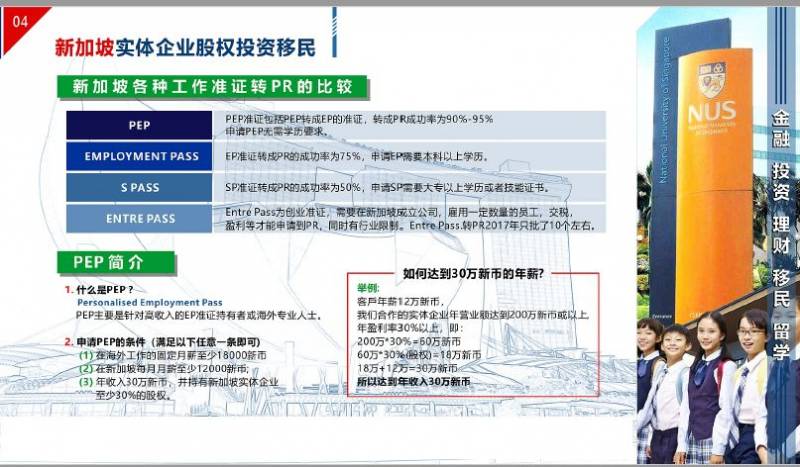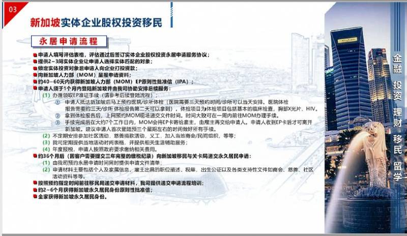 申請人參股新加坡實體企業三年,成爲實體企業股東。通過投資的方式,獲得新加坡高級管理工作准證入境新加坡,三個月即可開展新加坡生活,獲得工作准證後,可快速成爲新加坡稅務居民,不受CRS管制。最終全家可獲得新加坡永久居民身份。