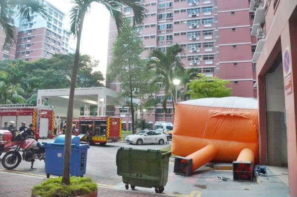 民防部隊鋪設氣墊防止被告跳樓逃脫。(檔案照)