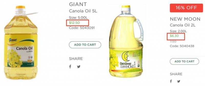 巨人超市品牌的5升菜籽油只要12.5新幣,新月品牌2升菜籽油打折後還要6.30新幣一桶