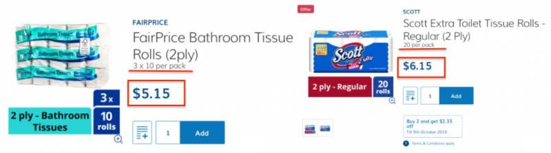 同樣的衛生紙,職總平價超市(Fairprice)品牌的30卷只要5.15新幣,而其他品牌20卷就要6.15新幣
