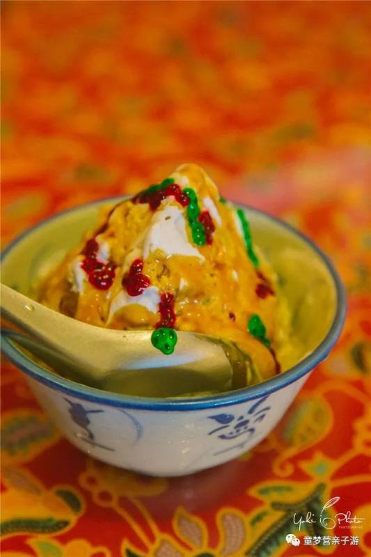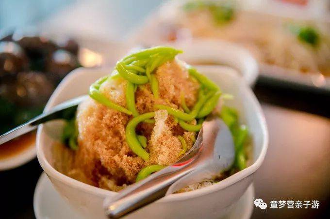 我沒搞明白這個像芥末一樣的綠條是什麽,吃了一口,口感有點像甜的糕點一樣,問了下服務員,說是煎蕊。 它本是馬國印度人的著名甜點,主要成分是冰,然後就是一種由Pandan葉汁(現在多已改爲綠豆粉)制成的有濃濃青草味綠色細條,吃時不可缺少的就是淋上特制的椰漿和黑糖。我在上海從來沒有吃到過,很是喜歡。