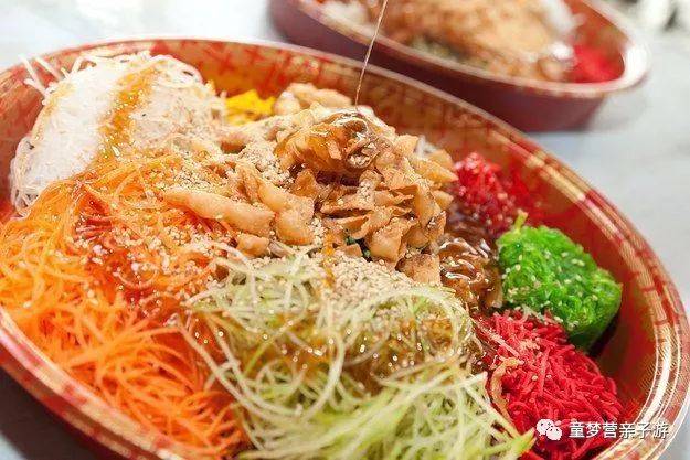 撈魚生,是流傳在南洋地區的年菜,它被賦予了“風生水起,步步高升”的吉祥寓意。是以生魚條爲主食材,搭配色澤鮮豔的蔬菜絲及水果絲七彩缤紛、色澤誘人。