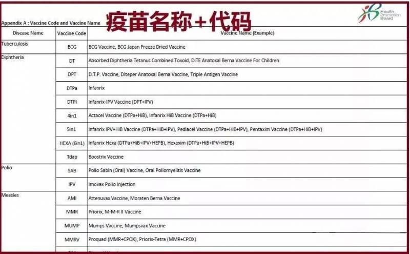 很多寶爸寶媽發現,新加坡和中國的注射疫苗有點不同,以下是一類疫苗列表: