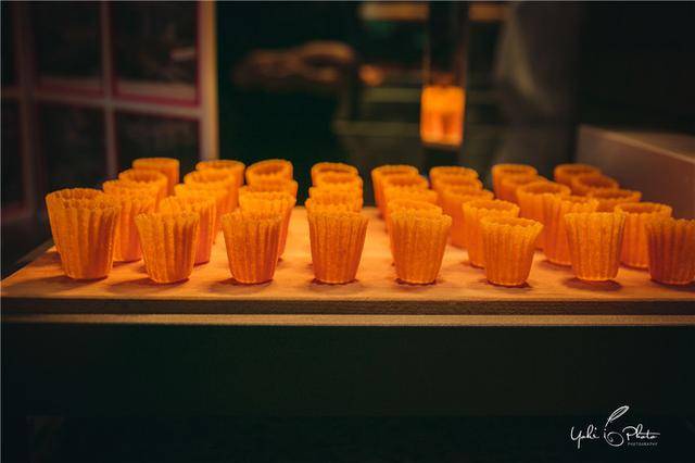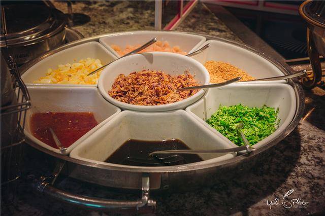 將你想吃的食材, 比如土豆絲,胡蘿蔔絲,花生碎,小蝦皮,盛入小金杯後,一口咬下去,先是炸過的面粉脆脆的口感,然後各種香味在口中炸開。果然是有著熱辣娘惹風的食物!