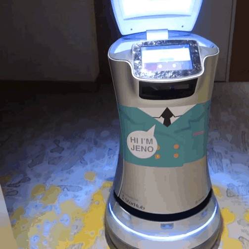 晚餐後回房間叫客房服務又有驚喜,不一會電話響起,讓我開門,還在納悶爲何不直接敲門,開門就看見這位小可愛,忍不住尖叫雞附身,原來是酒店的機器人管家,給我來送水的是男管家Jeno,據說還有穿粉色制服的女管家Jena!我猜Jeno值夜班,Jena負責白班?