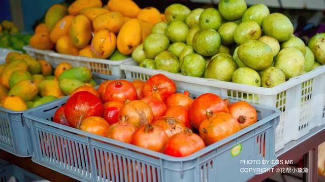 街道旁密集著許多商店和水果攤,蔬果看上去新鮮幹淨,中間夾雜著很多買服飾和金銀飾品的攤位,印度特色的花環都是用鮮花串成的,茉莉、蘭花、雛菊被一朵一朵串起來,變成長的、圓的各式花環,有些挂在門店兩旁,有的別在披著各色紗麗的印度女人辮梢上,就這樣漫無目的的走街串巷,收獲了不少美拍。