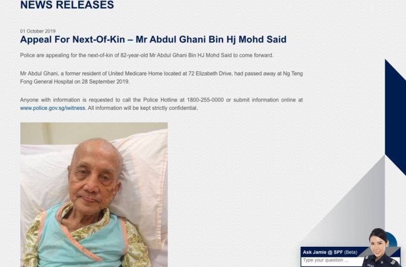 Abdul Ghani Bin HJ Mohd Said先生享年82歲,生前同樣住在伊麗莎白大道72號療養院United Medicare Centre nursing home中,于9月28日在黃廷芳綜合醫院去世。