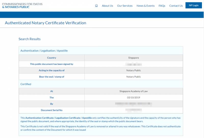 加了二維碼和做進一步認證之後,掃碼就可以在新加坡法律協會的網站上查詢公證書的真僞,超級厲害有沒有!這個是法律協會輸入公證書編號和認證編號後查詢的內容——