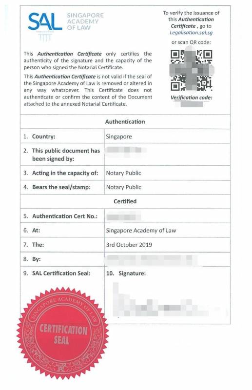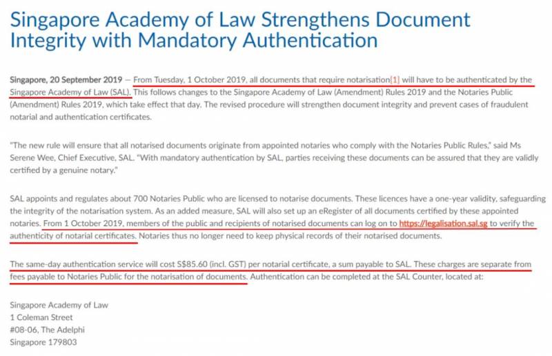2019年10月1日起,根據新加坡法律協會 (SAL) 最新規定要求,公證程序有所調整。法律協會要求公證人律師須把公證書上傳至協會存檔,並到協會櫃台辦理認證。此後公證書信息可通過法律協會網站查詢驗證。費用另外收取85.6新幣,其它翻譯和律師公證收費程序不變。
