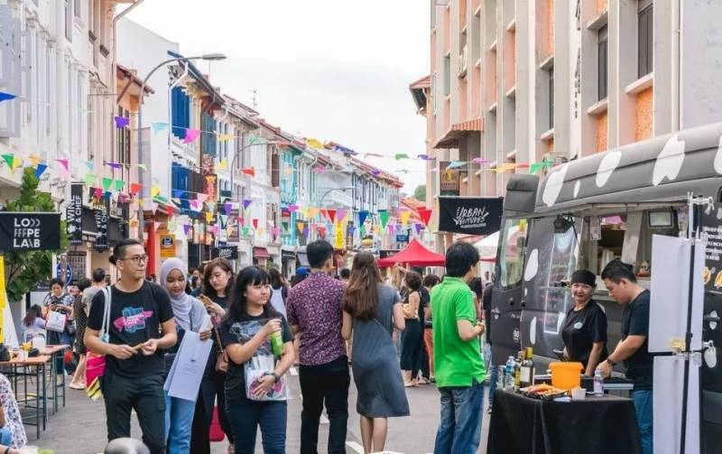 在禁止車輛通行的街道上進行音樂表演、舞蹈課、藝術裝置,當然,路上還會有很多攤販。街道的兩端都會響起震撼的節奏—從Keong Saik Road本身的Selector’s Stage到與Jiak Chuan Road相鄰的Tropical Heat Hangout。可以參加社區項目,或在微型織布機上編織哦
