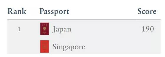 全球居留權和公民身份顧問公司“恒理”公布今年最新一季全球護照指數,日本和新加坡因護照可免簽或落地簽進入190個國家地區,兩國再度並列第一。