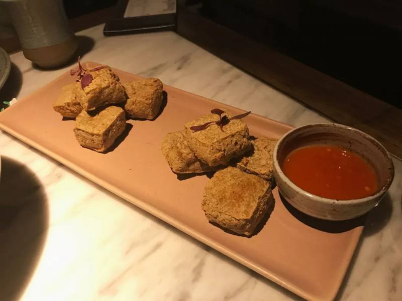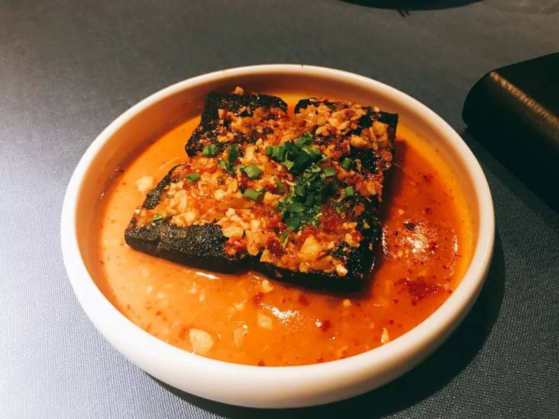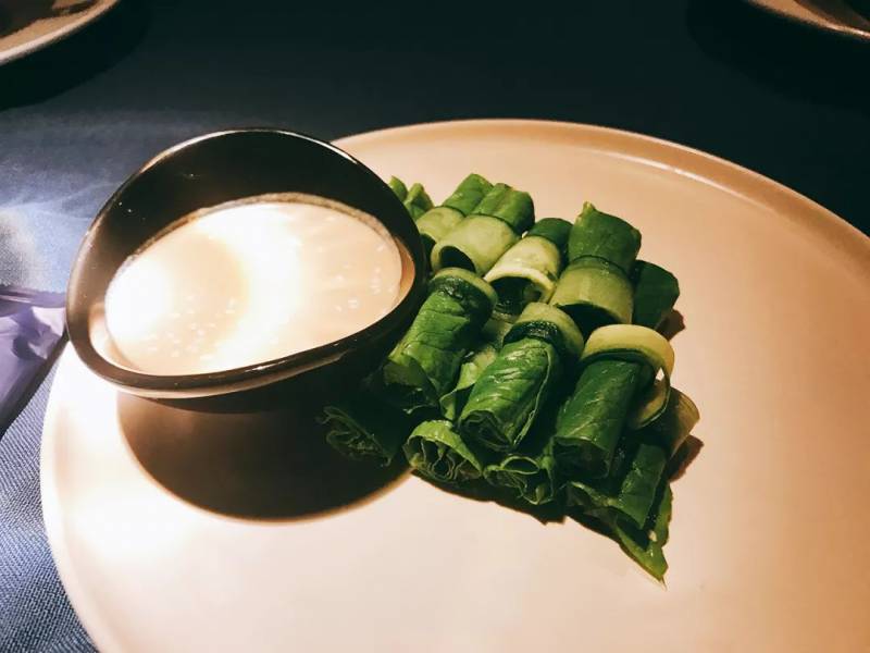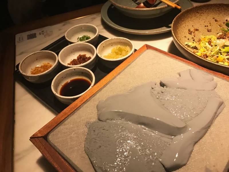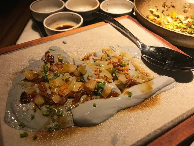 這次吃的幾道菜中,這道“養生水磨黑豆腐”還有點意思,偏青灰色的豆腐,口感像豆腐腦,配了很多種調料,可以自行搭配,可清淡可重口,而且感覺挺養身哈哈~