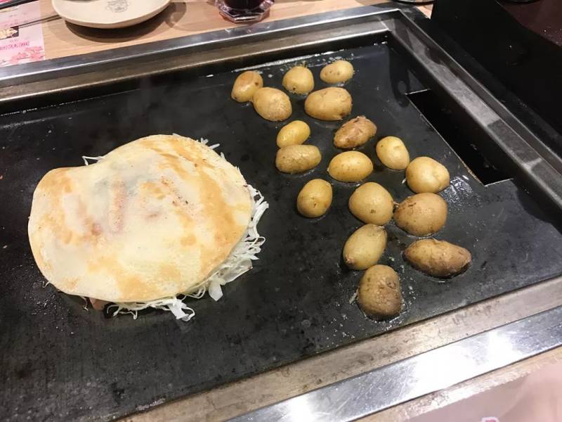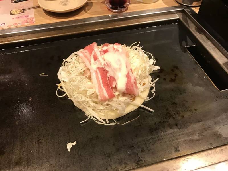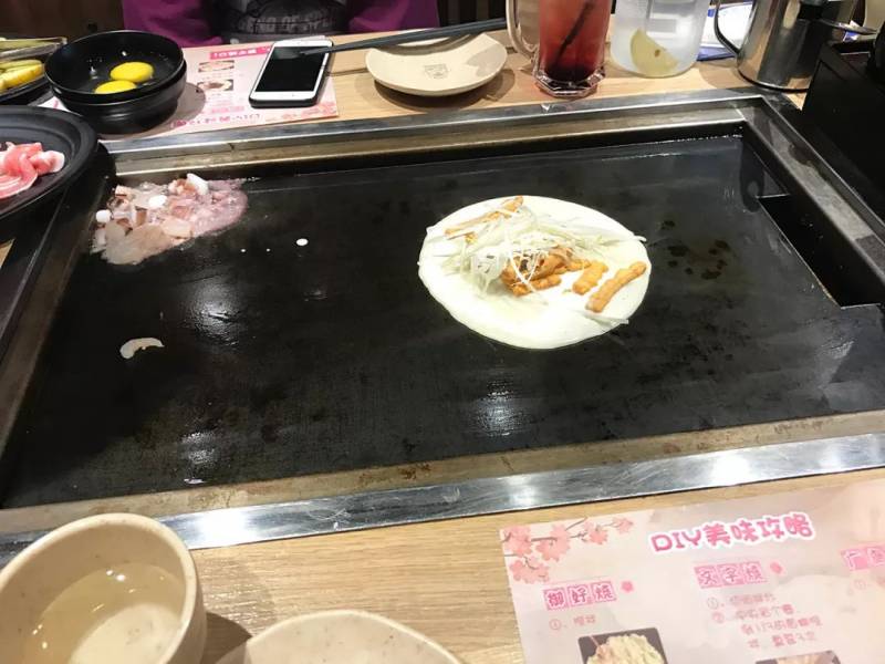 初到店內的時候滿懷驚喜,因爲每個桌子上都有鐵板,可以自己動手做的那種,跟我們在日本吃的大阪燒店幾乎一模一樣的布置!