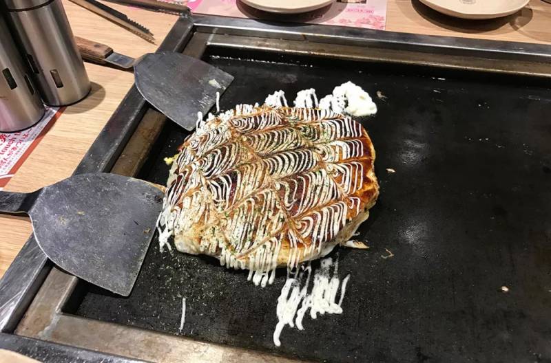 點餐後服務員會把所有原料一起端上來,然後在每個人的桌子上現場操作制作大阪燒~當然如果想自己做的話也可以動手試試體驗一下。