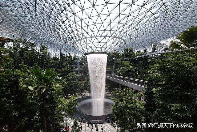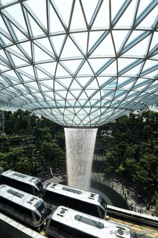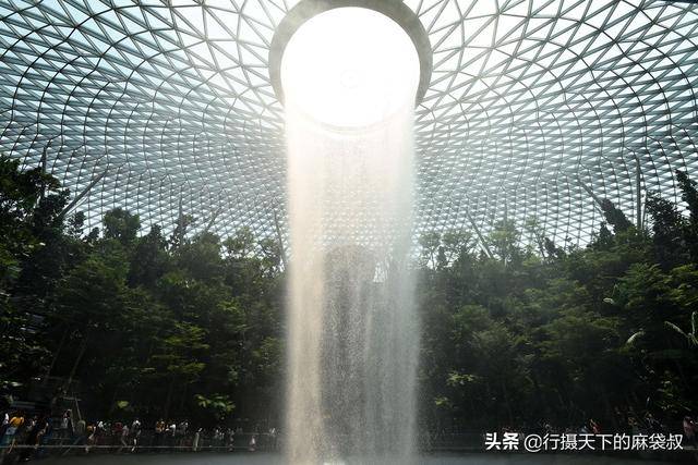 這個世界最高的室內瀑布達40 米高,從建築的圓頂上傾瀉下來,貫穿了建築的多個樓層。據說爲了適應新加坡多雨的天氣,落入室外噴泉的雨水將以每分鍾 1 萬加侖(約 37854 升)的速度泵入瀑布,並在之後用于灌溉周圍植物和機場建築服務上。