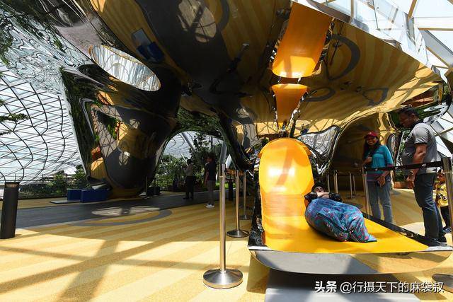 奇幻滑梯,就在星空花園旁邊,是新加坡第一座大型多功能互動雕塑滑梯,是結合了藝術妙想和無窮樂趣的滑梯。其中一項是需要佩戴好裝備,然後滑下去。剛好有老外遊客在嘗試,拍了幾張,感覺裝備很像一床被子和睡袋之類的。