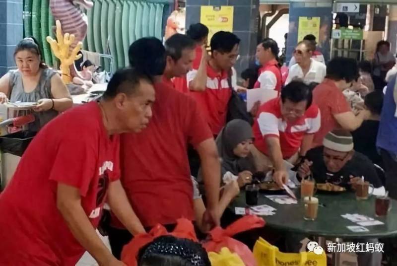 穿紅衣服的前進黨黨員,從某個角度看,很像是在“騷擾”那些享用美食的公衆。(吳作棟面簿)