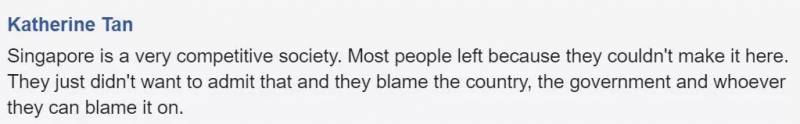 “新加坡是一個競爭,非常激烈的社會。很多人離開是因爲無法做到,他們只是不想承認這一點,就把責任歸結到別人,甚至是新加坡的身上。”