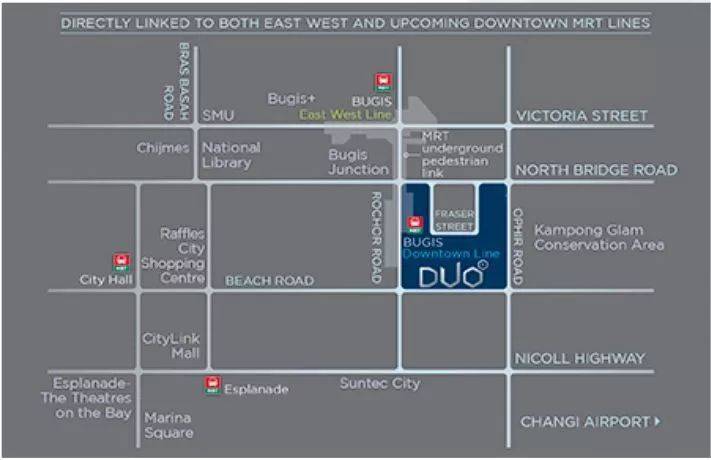 DUO Residences(雙景嶺)交通便利,有地下通道直達武吉士地鐵站(Bugis MRT)該站營運地鐵東西線(East West Line)和濱海市區地鐵線(Downtown MRT Line)。
