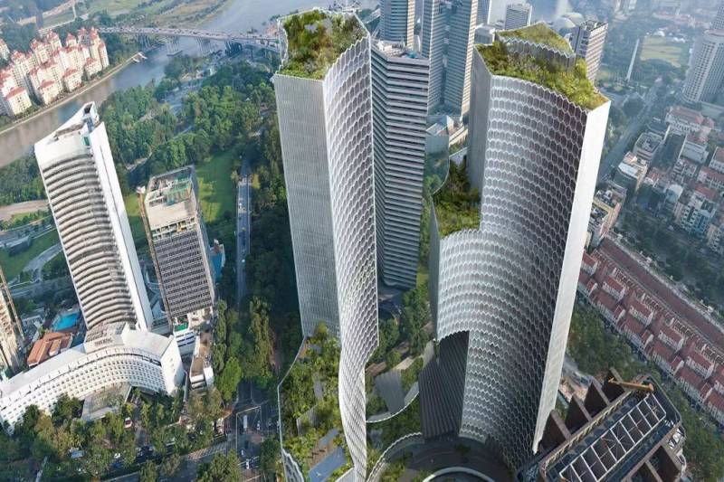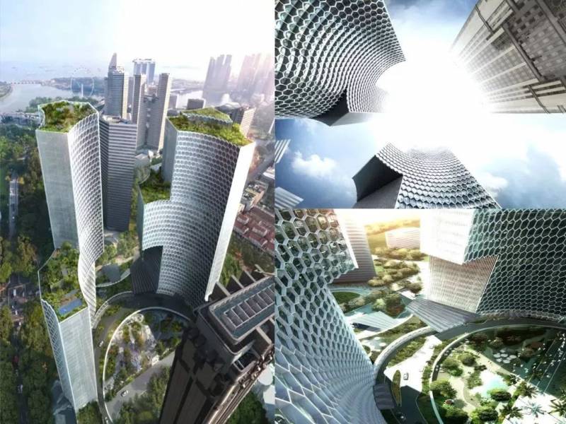 DUO的建築是由國際著名建築師奧雷舍人(Ole Scheeren 代表作:北京中央電視台總部等)所設計,造型獨特,外形時尚,藍灰色外牆,錯落優質的六邊形設計,給人耳目一新的感覺。