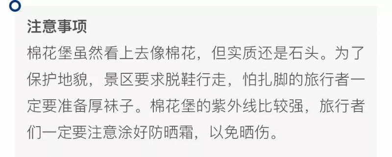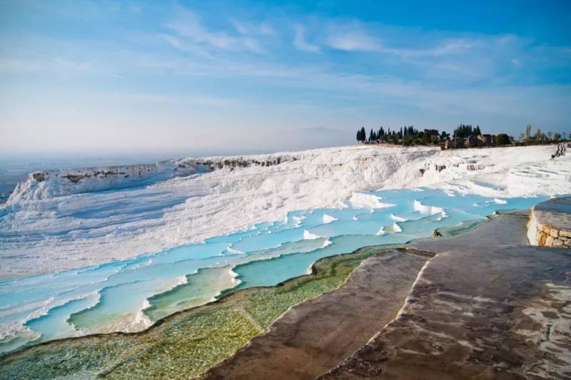 N年以來,溫泉水汩汩從地底湧出,順著山丘的邊緣傾瀉而下。在漫長的歲月中,石灰質的礦物堆積在岩石表面,形成一個個潔白的梯台,如雲朵,如棉花。層層疊疊的凹槽中,蓄滿了純淨溫泉水,淺淺的藍綠,全都是誘惑至極的天然溫泉湯池。遠望如朵朵棉花堆積成的城堡,故名帕姆卡萊(Pamukkale),意思是棉花城堡。