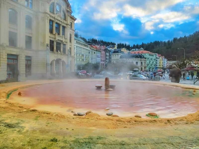 卡羅維發利是捷克的溫泉療養勝地,這裏的熱礦水是高價值的礦産資源。熱溫泉回廊(Sprudel Colonnade )是內部最大、水溫最熱的古老溫泉。傳說,1350年,皇帝查理四世的一條獵犬不小心跌入溫泉,他因此偶然發現了這裏的溫泉,所以卡羅維瓦利溫泉又稱“查理溫泉”。