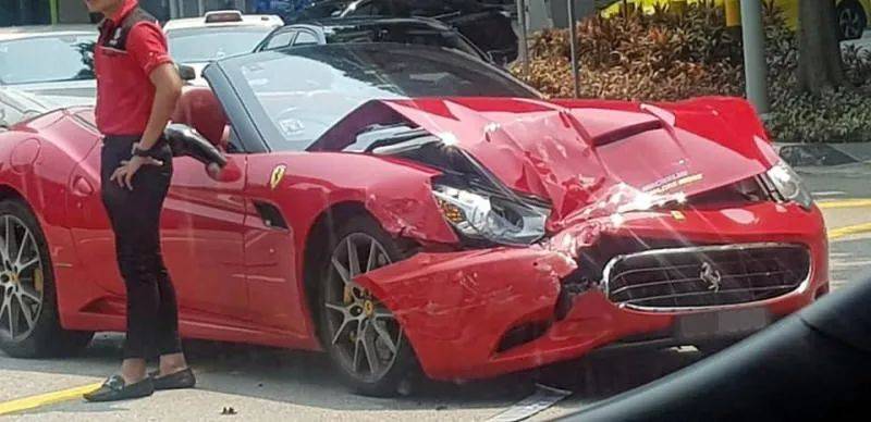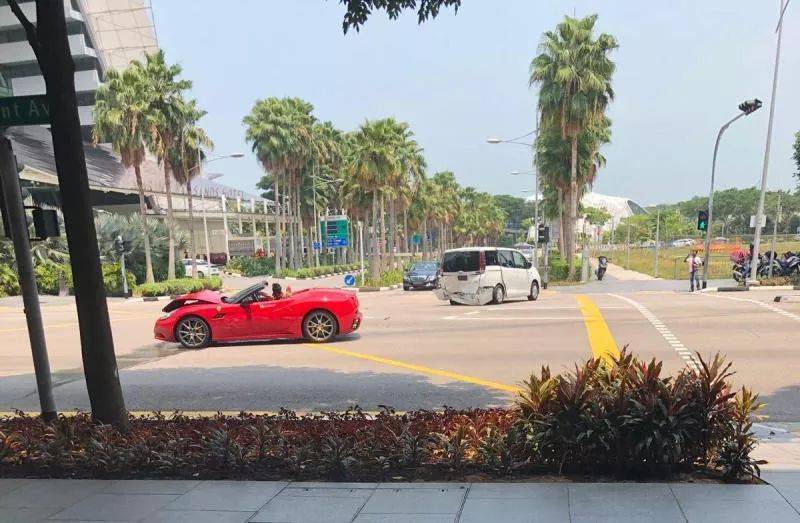 不過,當時一輛紅色的法拉利California行駛在右邊第二條車道,相信爲閃避豐田汽車而往右拐,撞上正在等待右轉的白色豐田Noah休旅車的車尾。