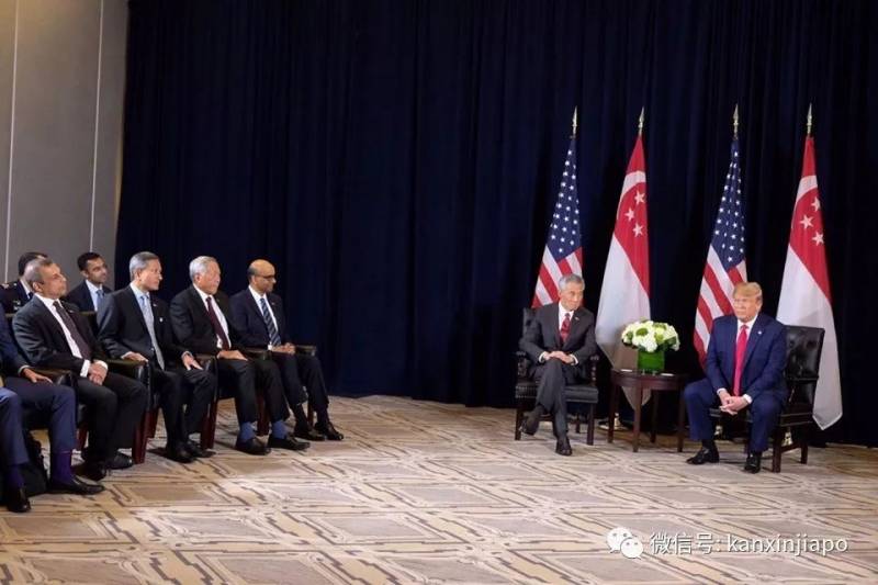 李顯龍是在新加坡時間的9月24日淩晨,與美國總統特朗普會面,並簽署了諒解備忘錄修正議定書。當時,新加坡內閣資政尚達曼(左邊前排右一)、國防部長黃永宏(左邊前排右二)等政要出席了簽署儀式。