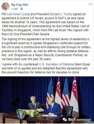 新加坡國防部長黃永宏,也在個人臉書上宣布了這一消息。