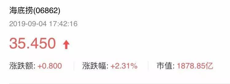 今年8月29日,海底撈股價37.7港元,創曆史新高。據最新股價(9月4日收盤價),海底撈35.450元/股,市值1878.85億元。