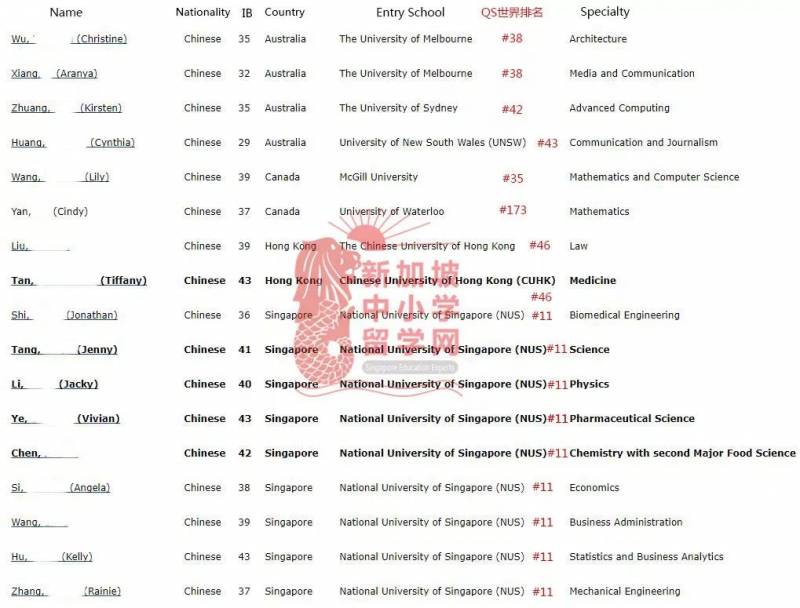 這26名中國學生,都是在2018年參加IB考試,于2019年入讀大學的學生。申請上的大學大多在世界排名前50,其中,入讀亞洲排名第1,世界排名11的新加坡國立大學的,就有9個人!