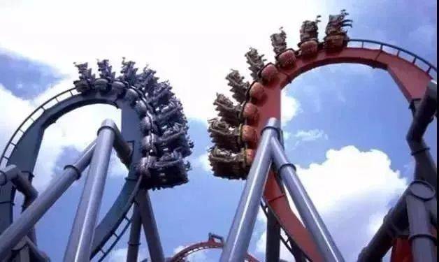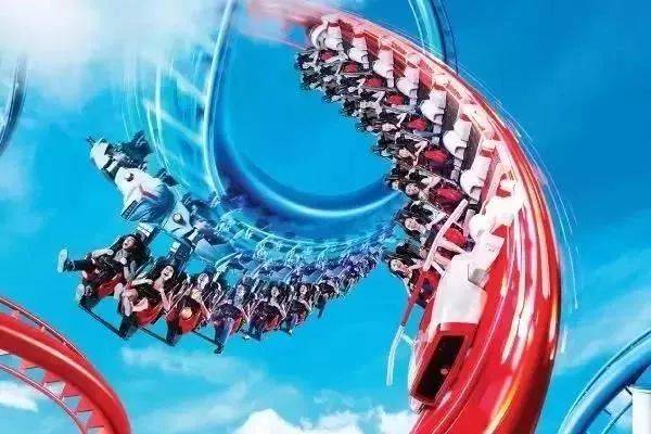 紅色過山車是座位式的,時速91.91公裏;藍車是吊腳式的,速度沒有紅車快,但因爲它會轉兩個360度的圈,比紅車更刺激。