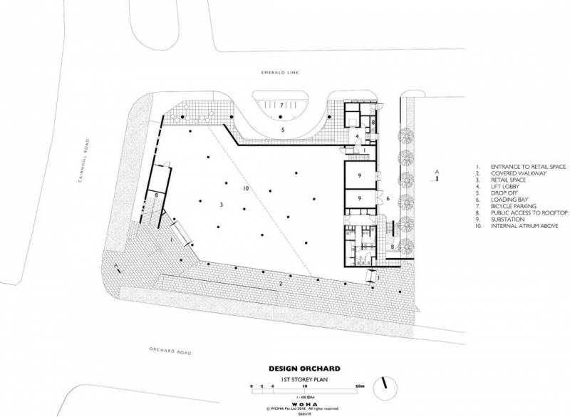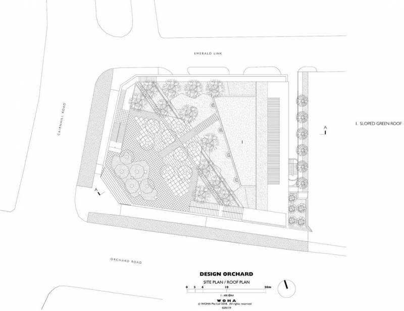 在烏節路(Orchard Road)和經禧路(Cairnhill Road)的交彙處,三層高的建築呈階梯狀逐漸下降,建築在道路轉角處的切角十分方便街道上的人們進出。屋頂的露天劇場被蔥郁的花園環繞並完全向公衆開放,從而將100%的場地面積歸還給城市本身。