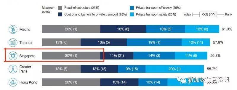 在入榜的十大城市的總體城市交通排名中,新加坡以64.1%的最高總得分名列榜首,領先巴黎、香港、倫敦等城市。
