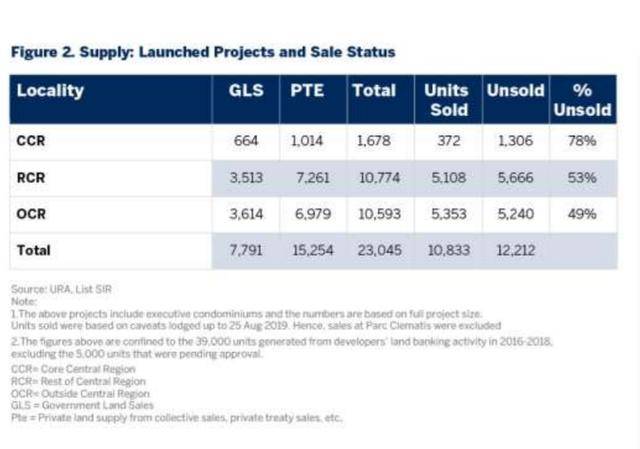 讓我們評估2016年至2018年開發商活積極開發土地所産生的的39000套新房的現狀。2018年7月宣布降溫措施後,集體銷售市場陷入停頓,因爲開發商現在必須在購買開發土地時額外支付5%的不可彙反的買方印花稅(ABSD),如未能在五年內出售所有住宅,另須支付25%ABSD。爲防止供應進一步增加,政府還在2019年減少了其土地銷售計劃的新供應量。這爲開放商清除存量預留了一些緩沖時間。