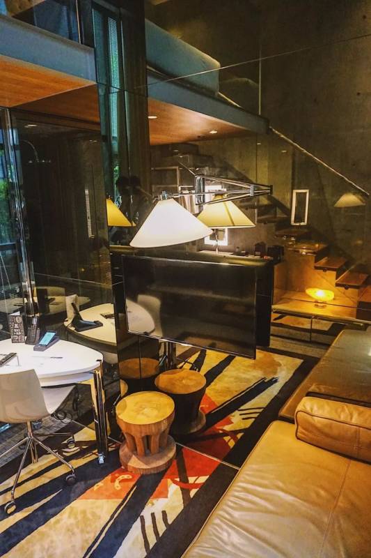 進入房間,就被這獨特的室內環境驚豔了! 房間設計采用挑高式設計,而牆面也精心選擇了鏡面設計,使房間賦予了更佳的呼吸感!暖黃色的燈光配上具有現代複古家具,給房間一種更特殊的美感。