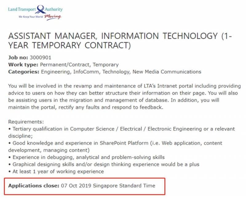 因此NTU和NUS的同學們想要求職LTA是很有優勢的,LTA發布出來的職位可供同學們選擇的並不多,對于經驗的要求都比較高,不過他們的1-YEAR TEMPORARY CONTRACT這樣的項目大家還是可以嘗試一下的: