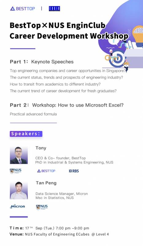 最後,NUS的同學們看過來!BestTop聯合NUS EnginClub開展了Engineering主題的校園活動,本次活動僅限NUS的同學參加,同學們可以通過NUS EnginClub進行報名喲,詳情請看海報: