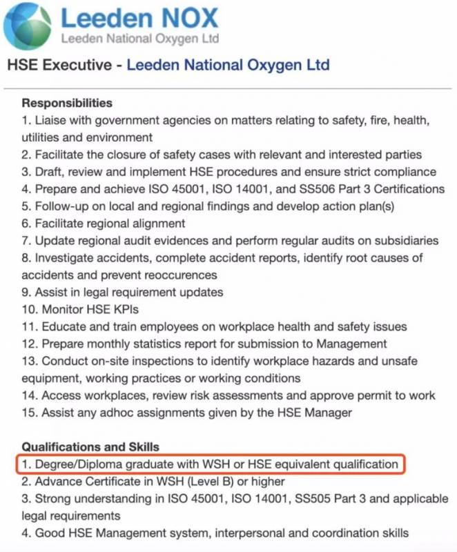 由于新加坡政府對工業生産安全的高度重視,安全類工程專業,如Environment, Health and Safety Engineering,學生就業方向也比較廣泛。比如亞洲領先的燃氣與焊接企業Leeden Nox,和SINOTCC就專門在職位要求中點名要EHS專業背景的學生: