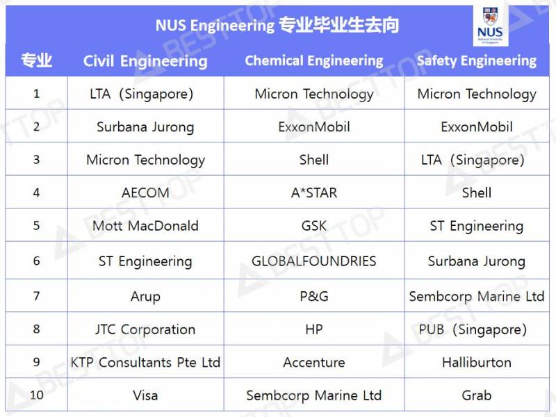 從統計裏可以看到,NUS這三個專業的就業方向都比較相同;LTA(Singapore),ExxonMobil以及Micron Technology這三個企業基本都進入了前三,由此可見NUS的學長學姐們對這三個企業的偏愛。